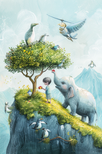 A soft pastel-style illustration of a joyful boy receiving a gift from a cute elephant, with an olive tree in the background, on top of a grassy mountain. Penguins, ostriches, Takahē birds, and Kakapo join in, on the mountain in the background a small airoplane, and a helicopter. Gentle hand-painted textures, vibrant yet soft colors, minimalist children's book illustration --ar 2:3 --v 6.0