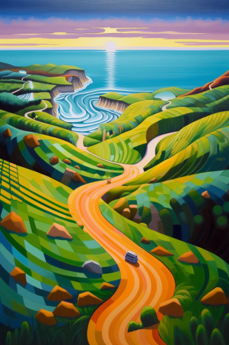 Painting looking straight down from the top of a very steep grassy mountain to a beach and the sea at midnight in the style of Alan Kenny --ar 2:3 --v 5.1