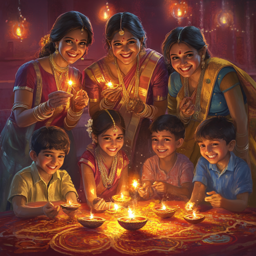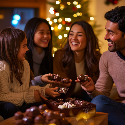 Visually appealing and festive photos of families with a mom, dad, and two young children in festive outfits on a black background with gold paper garlands in a Christmas theme --v 6.1