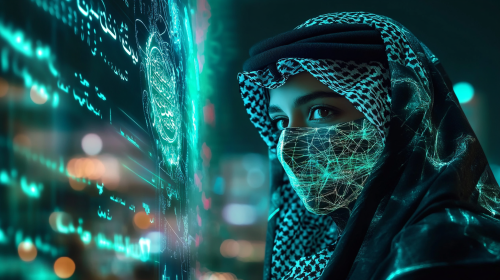 Work integration About Saudi National Day A Saudi person wearing the Saudi flag In the background is the digital transformation of Saudi Arabia --ar 16:9 --v 6.1
