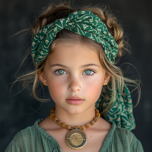 A beautiful young girl wearing a green Arabic-style headband with white calligraphy of the New Mexico state flag design and a gold medallion around her neck, against a black background. This award-winning photography is in the style of Hairstylem Tête de Fil d'Chair Studio, a portrait of the child. --v 6.0 --s 750
