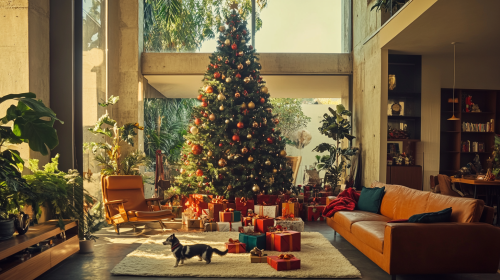Wonderful Christmas celebration. At a Mexican modern house. With a beautiful big Christmas tree and a lot of Christmas gifts. A happy modern Mexican Family is opening gifts. There is mom, dad, a girl and two guys. There is a happy strong Husky playing and a happy tabby cat playing jumping. Christmas vibes. Full shot photo. Full scene. Ultra wide photo. 16 mm lens. Magazine photo. Ads photo. Cinematic. Stock photo style. Photo direction. Art direction. --ar 16:9