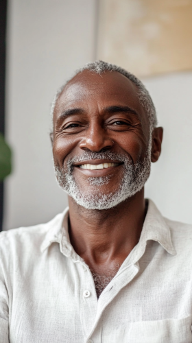 portrait of old black man 45-year-old afro-american man with short hair are smiling happy, zoom call, minimal room background, realistic, --ar 9:16 --v 6.1