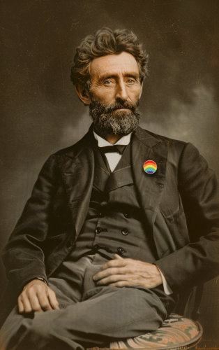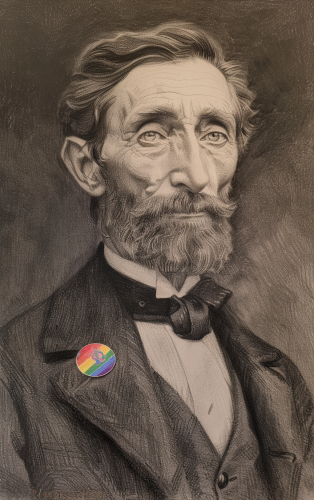 Monochromatic portrait, in pencil, of Henry David Thoreau, similar to the pencil drawing by Samuel Rowse. The only color is on a small gay pride button, with pride flag colors, in Thoreau’s lapel. --ar 5:8