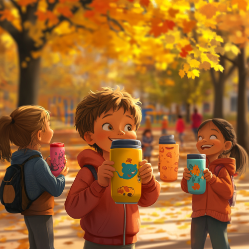 photo of A schoolyard scene with children ages 6-8 during a break, holding various colorful kids' thermos cups, laughing and interacting. Focus on one child drinking from a thermos with fun cartoon designs, with other kids in the background holding their own cups. Soft, natural lighting, autumn trees with a mix of yellow and orange leaves, and a playground visible in the distance. The mood is friendly and joyful, capturing the warmth of childhood friendships and daily school life –– photorealistic, warm colors, high detail.