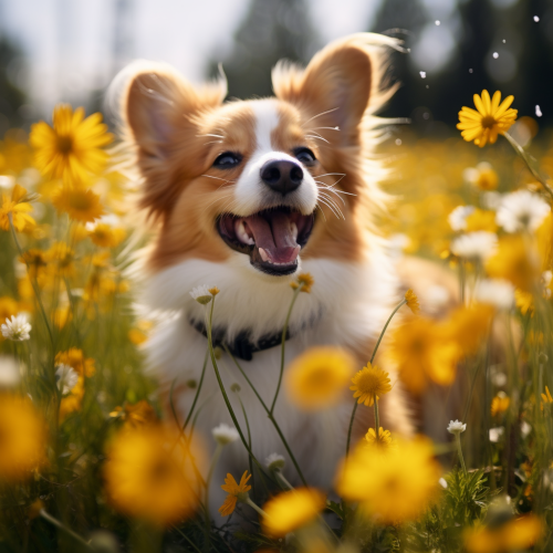 corgi australian sheperd mix orange dog with white spots in a field of dandelions, realistic