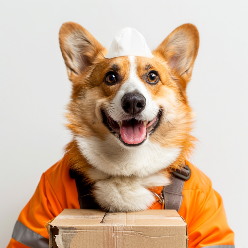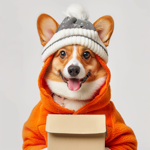 portrait photography of a happy corgi dog as deriveryman with orange hood and white cap, he is holding a empty paper box, white background --style raw