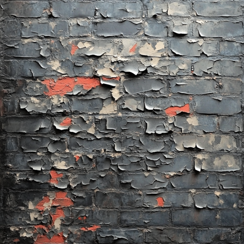 Ultra-realistic 8K view of a 5x5 meter dark charcoal-gray wall with peeling paint that subtly reveals red bricks underneath. The surface has a gritty, weathered look with intricate textures and chipped edges, creating an authentic, aged feel. Soft, natural lighting enhances depth and detail, casting gentle shadows across the entire 3x3 meter surface