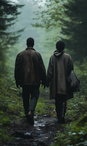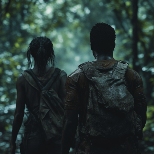 A photorealistic image of a black man and a black woman walking looking through the forest in a dystopian future. Thier clothes are modest and worn. They live off the grid and have no electronic items with them. Dark Cinematic shot with bokeh. Movie quality shot on an IMAX camera. --ar 3:5 --v 6.1
