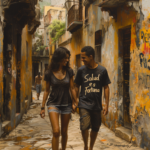 happy couple walking along Calle 8 with identical black elegant shirts labeled with the writing "Primolino", superrealistic --style raw --stylize 700 --v 6.0