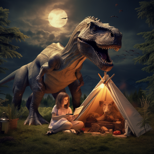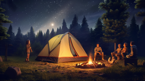 A family of four (two adults and two children) camping in a lush forest clearing. They are gathered around a campfire, roasting marshmallows, with a tent pitched nearby. The backdrop showcases tall pine trees and a clear starry night sky. Medium: Photography. Style: Hyper-realistic with a touch of nostalgia reminiscent of classic family camping trips. Lighting: Soft ambient light from the campfire casting gentle shadows, with a hint of moonlight filtering through the trees. Colors: Warm earthy tones with pops of vibrant colors from the camping gear. Composition: Nikon D850 DSLR camera, AF-S NIKKOR 24-70mm f/2.8E ED VR lens, Resolution 45.7 megapixels, ISO sensitivity: 640, Shutter speed 1/60 second, f/4, depth-of-field showcasing the family in sharp focus with a slightly blurred background. --ar 16:9 --v 5.1 --style raw --s 750
