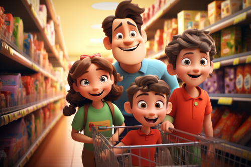 kids coming together grocery store aisle, people shopping, closeup view, cartoon style, disney style, cinema 4d, --ar 3:2 --s 250