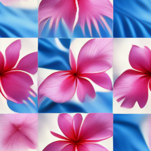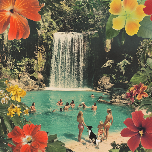 a photograph of multiracial, happy children with pets at an upscale hotel in hawaii at sunset. There are collaged-on, cartoon-like, brightly colored tropical flowers like hibiscus, gardenia, and plumeria on the photograph.