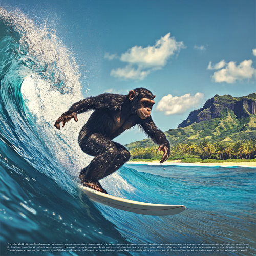 "An ultra-realistic photo of a monkey surfing on a massive wave at a famous Hawaiian beach. The monkey is skillfully balancing on the surfboard, catching the towering wave as it curls over. The bright blue ocean sparkles under the tropical sun, with the iconic Hawaiian coastline and lush green mountains in the background. A few fluffy clouds dot the clear sky. The scene is vibrant, dynamic, and action-packed. Cinematic composition, 16:9 aspect ratio, photorealistic style."