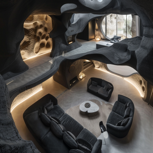 a living room in an aerial view of a black innovative house, in the style of isaac julien, organic stone carvings, 32k uhd, desertwave, minimalist sets, poolcore, rustic futurism, in the outskirts of london, minimalist, luxury, stylish, white lighting from below up to the front of the house