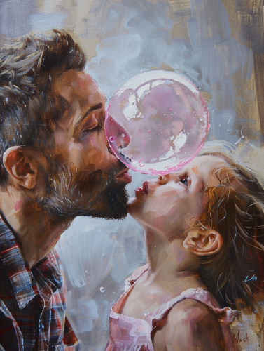 .**fine art painting of a little girl blowing a big pink bubble into the face of her daddy --ar 3:4 --v 6.0