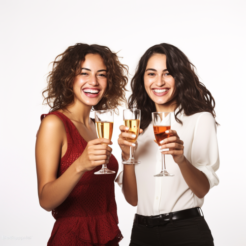 2 beautifull smiling and celebrating girls showing champagne stock photo, age 24, in the style of a uhd image, dark orange and dark gold, photo, rhythmic movement, white background, animated gifs, dark beige and red, photo taken with a Sony Alpha A7R IV, canon EF24 - 24mm f11 lens