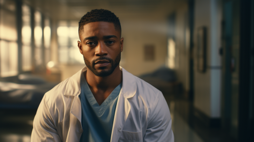 a movie about a black man diagnosed with HIV during the HIV epidemic. Show him back turned to the camera being diagnosed in an all white hospital. Real, realistic, cinematic, cinema, film, film grain. s 150 --ar 16:9 --s 250