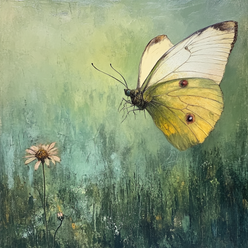 A large butterfly that has found happiness lands on a flower (bottom of the screen). A light green pastel painting of a rural landscape with few touches and a rough texture.
