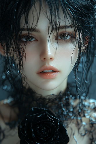 A girl with blue dress and long hair, holding red roses in her hand is walking through the flower sea of camellias. The background color should be white or light gray, creating an overall soft tone. Use simple lines to draw details on flowers. A cartoon character illustration style , best quality, 3D rendering, 8K ar 9:16 --v 6.1