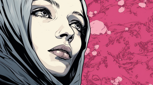 girl waer hejjab holding Palm fronds, pink and gray, without background, in the style of engraving, pencil sketch on old parchment, creative commons attribution, historical illustration,etching, black lines, scientific illustrations, soggy --ar 20:9