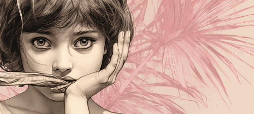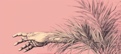 girl hand holding Palm fronds, pink and gray, without background, in the style of woodcut, engraving, pencil sketch on old parchment, creative commons attribution, historical illustration,etching, black lines, scientific illustrations, soggy --ar 20:9