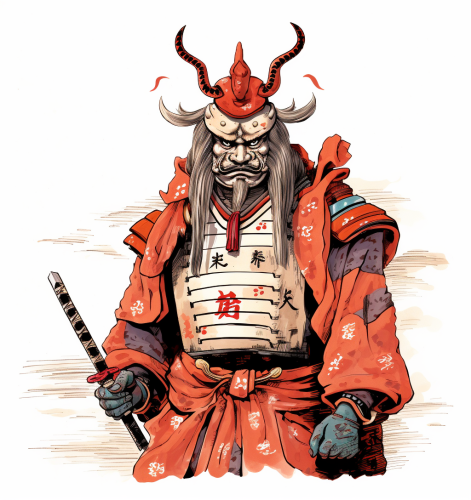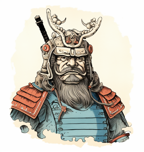 an ancient Japanese shogun, simple cartoony clipart whimsical book illustration, kodak portra, realistic detail, cross hatching, alcohol marker, minimalist illustrator, arts and crafts movement, creative commons attribution on a white background --ar 121:128