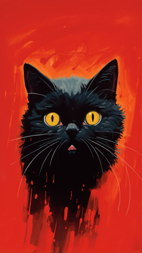 a black cat walking towards the camera, happy with his head up, a happy black cat, red background, Illustration style, rough yet expressive lines --ar 9:16