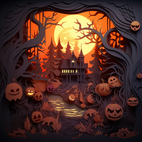 cartoon, landscape, halloween, haunted house, ghosts, bats, jack-o-laterns, autumn, night, full moon, fallen leaves, spooky, macabre,