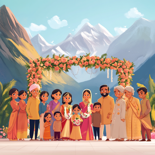 Create a Disney-style cartoon illustration celebration group of people getting a family picture in a indian wedding. wide shot in background mountains some kids some old people some young ones