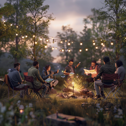 An energetic group of coworkers laughing and playing games near a campfire, some navigating an orienteering challenge with maps and compasses, while others sit nearby on comfortable chairs. Soft string lights hang above, creating a joyful atmosphere in a peaceful forest clearing. The background includes trees and a hint of twilight sky. photorealistic, Canon EOS 5D Mark IV DSLR, f/5.6 aperture, 1/125 second shutter speed, ISO 100 --v 6.0 --s 50