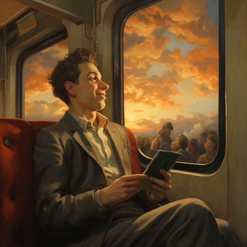 someone in a train, curious and appreciative, happy to watch through the window a wonderful sunset, while other people are watching their phones or computers, in the style of Norman Rockwell