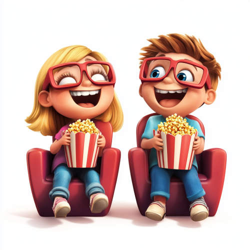 2 littke kids, little boy and girl, 5 years old, dark hair and eyes,having fun,hand pointing front, laughing, happy, sitting together on a red cinema chair, side by side, eating popcorn together, wearing 3d glasses, plain background, cute, animation, cartoon, 3d, pixar style