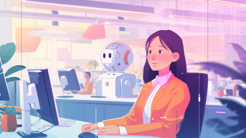 create an image of a happy employee using artificial intelligence to do her work. high res. --ar 16:9