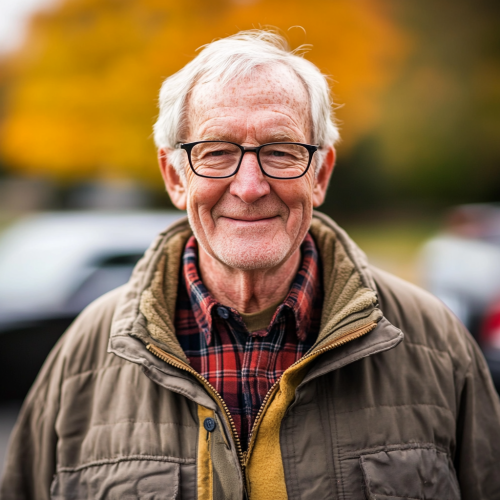 image is bright realistic photograph during fall of a 55-70 year old Candian woman depicting someone who is happy with the fact they made the choice to get senior life insurance. Normally pictures of ordinary looking people with an unusual or subtle expression in a normal place such as a park or car park or outside a grocery store, often holding something such as a smart looking envelope