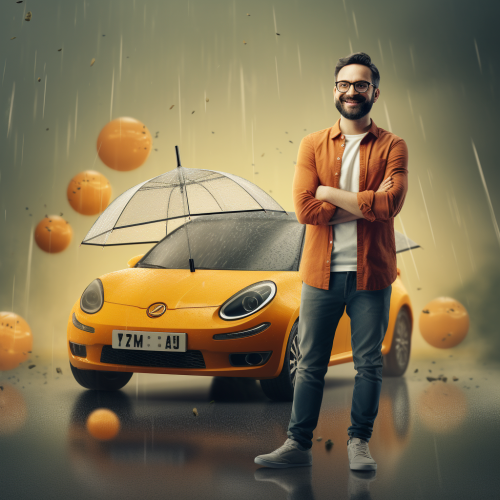 For our car insurance campaign, we need an image in a 1.91:1 ratio. It should depict a happy customer, visibly pleased about saving money. Next to him, there should be a slightly damaged vehicle. The theme of car insurance should be clearly emphasized, either through an insurance symbol or context. The focus is on safety, protection, and financial savings