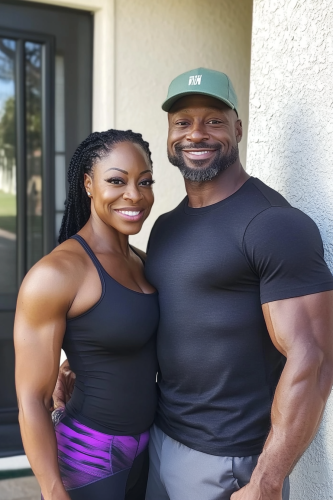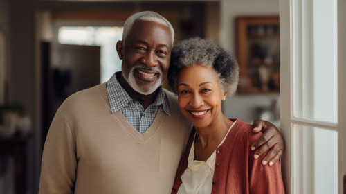 A medium shot of a black senior couple in their mid-50s standing, with a blurred backdrop of the inside of their house, happy. Use a Hasselblad camera with an 85mm lens at F 1.2 aperture setting and daylighting, --ar 16:9