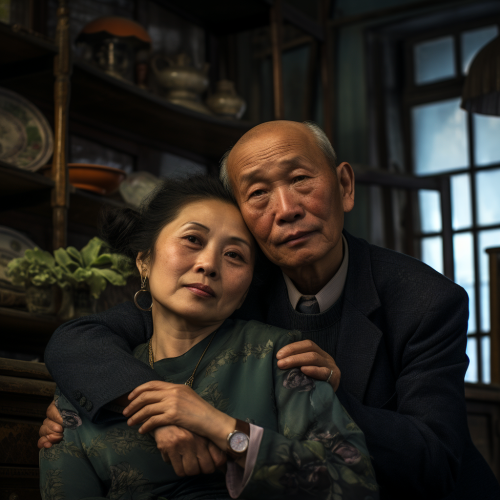 smiling senior asian couple standing front of their apartment building on a sunny day with palm trees and bushes hyperrealistic --ar 9:16 --v 5.2 --s 250