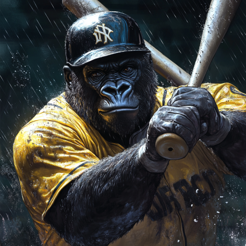 The player is GORILLA wearing a baseball uniform; let's create a dynamic baseball game scene. With two runs behind in the bottom of the ninth inning, the gorilla, the fourth designated hitter, is waiting for the pitcher to throw in a tense scene with the bases loaded and two outs. Sweat splatters, highlighting the mental strength, determination, and resilience of the players. A tremendous sense of dynamism.5k