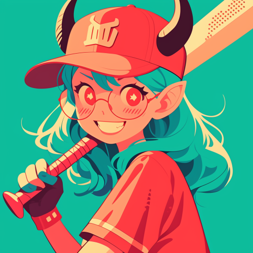 little devil girl dressed as a baseball player smiling with a baseball bat , vector style sticker , red and light turquoise teal color scheme --niji 6