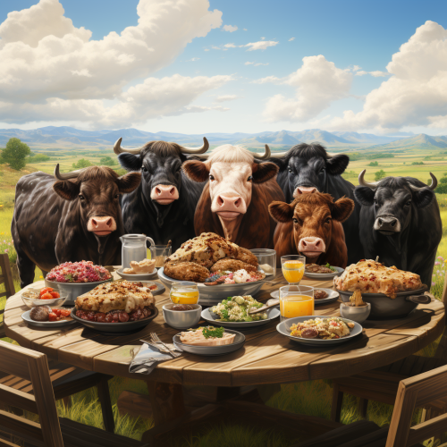 a mascot logo of an American bison standing on its back legs grilling steak over a round charcoal grill, hard edge painting, simple flat vector, barn red, yellow and green colors --no text, realistic photo details