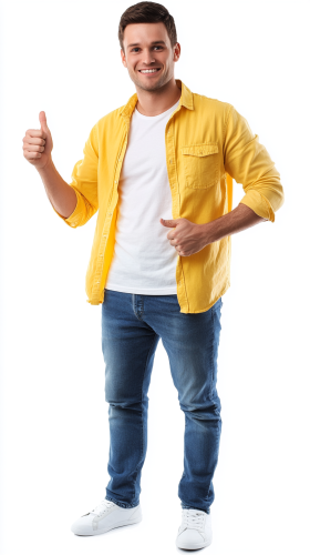 Foreground of a caucasian man with white t-shirt and open yellow shirt, slim fit blue jeans and white shoes. The man is giving a thumb up with one hand and the other hand is on his pocket. Full body, no background --aspect 9:16 --style raw