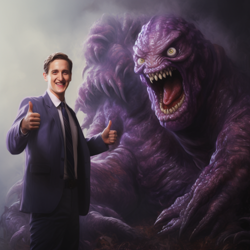 an image of an excited and happy young man and a happy purple-colored Lovecraftian monster standing across from each other, giving each other a thumbs up, excited, funny, photorealistic, hyperrealistic