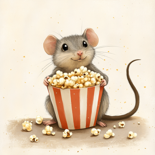 children's book style, a cute rat sitting on the floor with its back against a rectangular shaped popcorn paper cup with bits of popcorn around the rat.