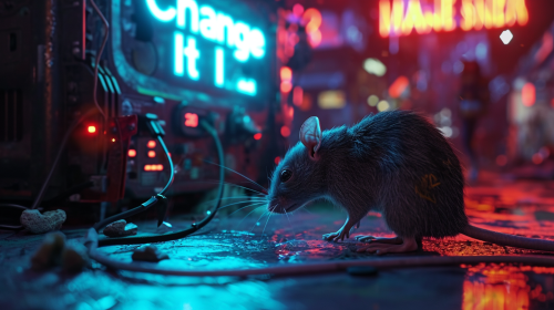 A cybernetic rat interfacing with a modular tech piece, a sign saying "Change It" projected next to it. --ar 16:9 --v 6.0
