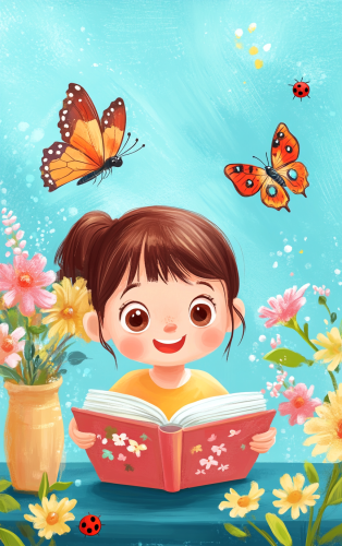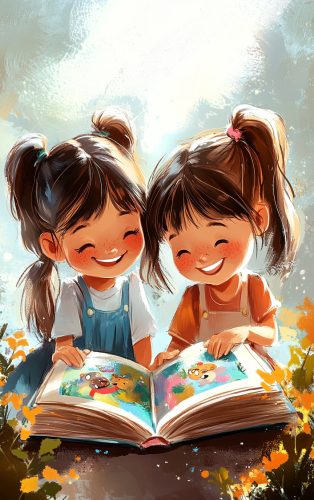 Illustration of two 7 year old girls smiling and readingin day light. have long brown hair tied in pigtails. An open book on their laps displays colorful illustrations. Bright colors, vibrant cartoon style, cute expressions, a magical atmosphere, sparkling effects, and soft lighting. --ar 5:8 --v 6.1