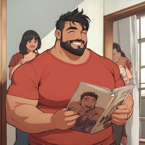 A chubby but muscular man with short black hair, black beard, tanned skin. He is wearing a red plain t shirt. he opening an magazine at his home. he is happy. there´s two people behind him happy in the style of anime character design from sailor moon