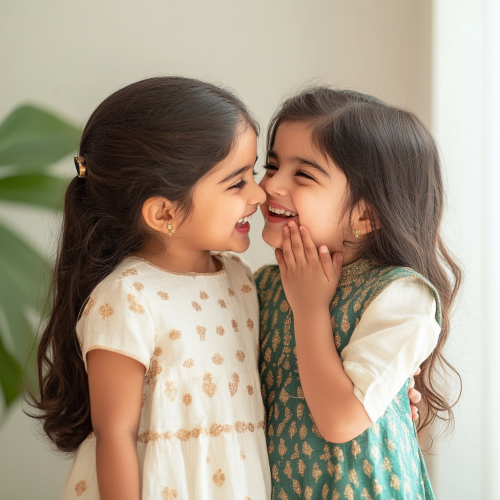 A five-year-old Indian girl standing next to her 15-year-old elder sister, who is gently touching both of her sister's cheeks. showing care. The setting is indoors with an off-white background, and both girls have happy expressions on their faces. They are stylishly dressed.