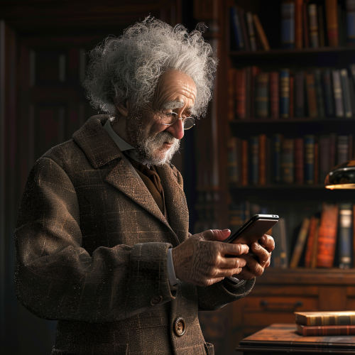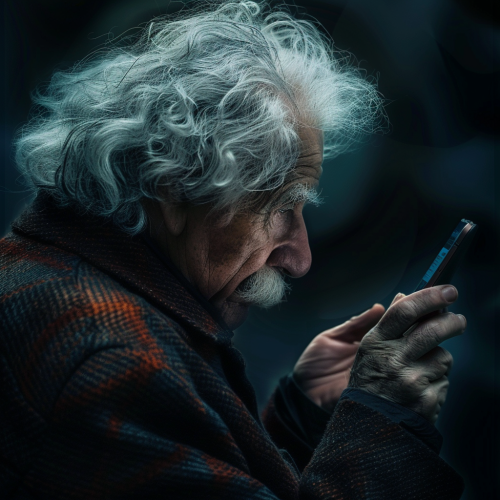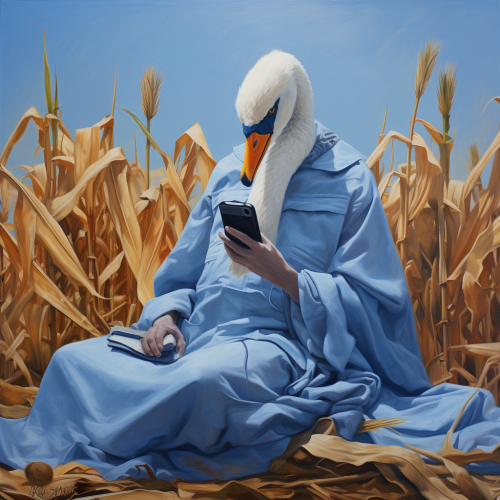 a blue happy hairy swan reading on tarpaulin, looking like Barbara Streisand, with a phone in a cornfield, apocalypse style, in 2050, in style of wes anderson