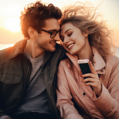 happy loving couple. photo on cell phone, insta post, realistic, cinema poster